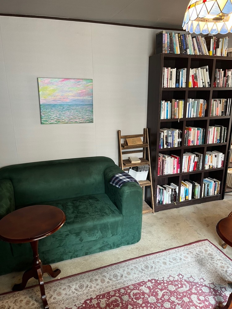 소파와 책장에 둘러싸인 서재같은 공간입니다.